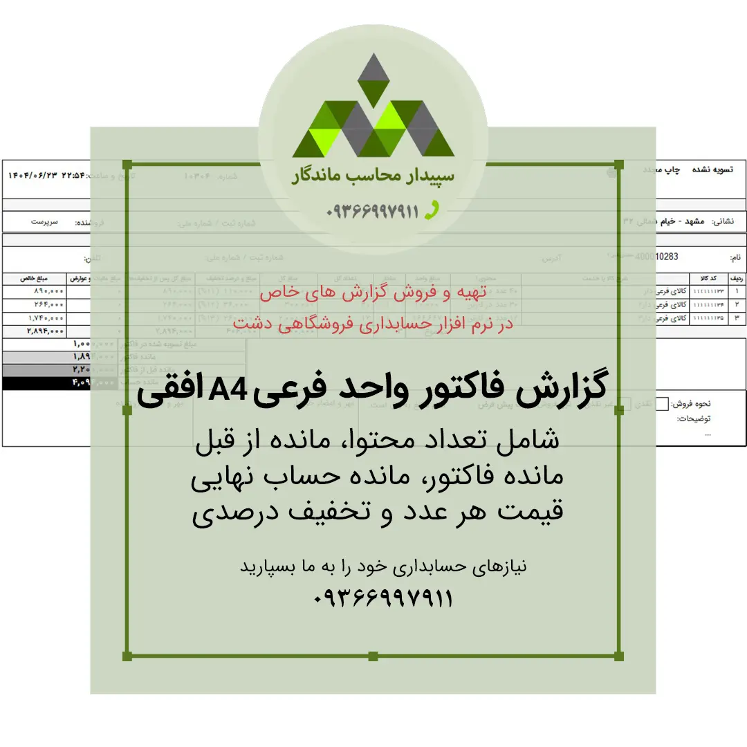 🔰 اگر به دنبال گزارش فاکتور واحد فرعی هستید که جزئیات دقیق فروش و مانده حساب مشتری را به شکلی کامل نمایش دهد، این محصول بهترین گزینه برای شماست.