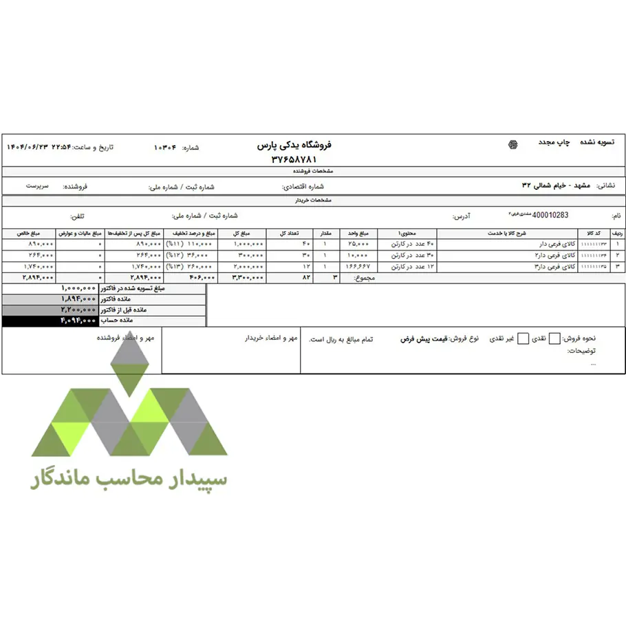 این گزارش ویژه واحد فرعی در قالب A4 افقی طراحی شده و شامل تمام جزئیات مهم مثل تعداد محتوا، مانده از قبل، مانده فاکتور، مانده حساب نهایی، قیمت هر عدد و تخفیف درصدی است. با این فاکتور میتوانید صدور صورتحسابهای خود را دقیقتر و حرفهایتر کنید.