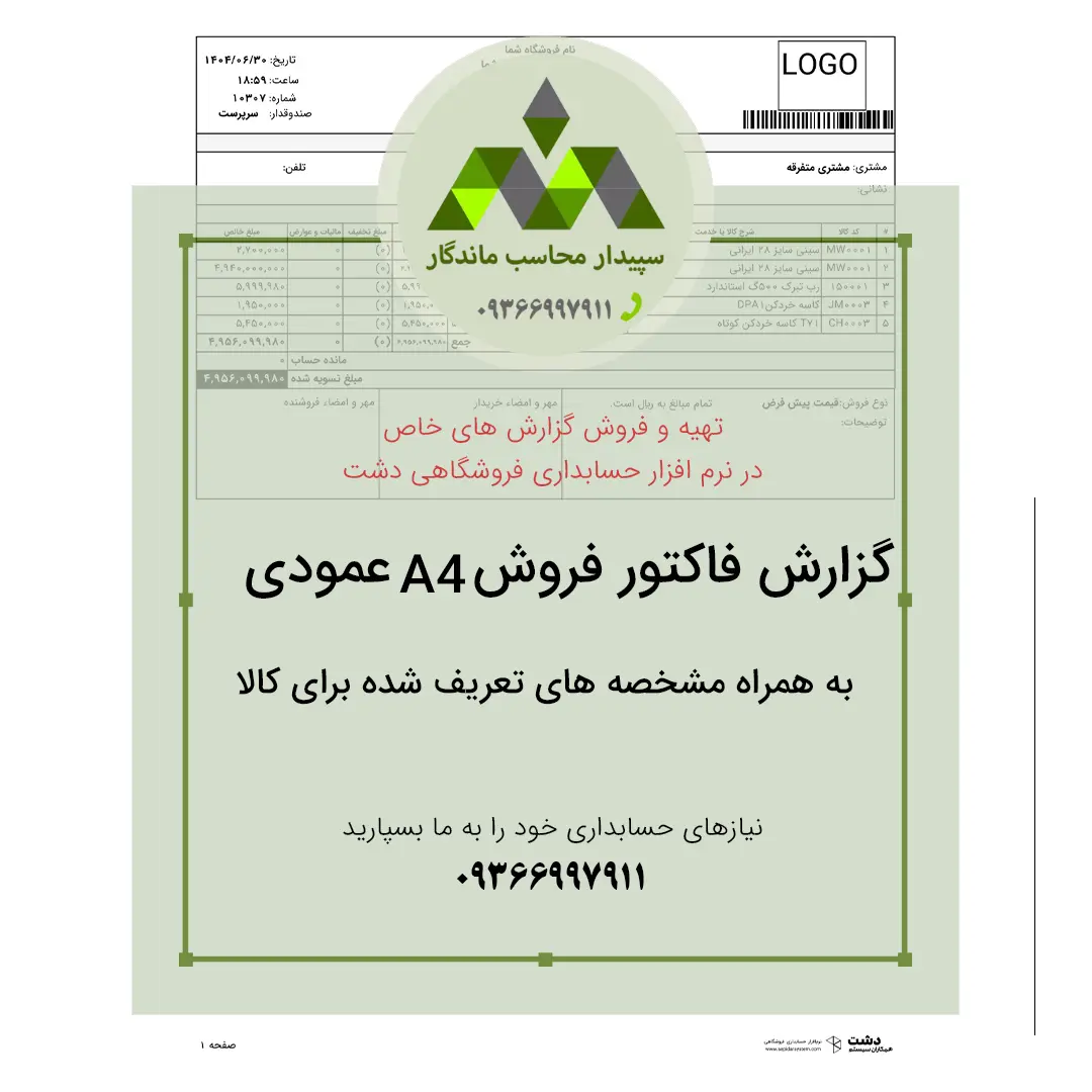 گزارش فاکتور فروش A4 عمودی با مشخصههای کالا یکی از حرفهایترین قالبهای چاپ فاکتور برای نرمافزار حسابداری دشت همکاران سیستم است.
