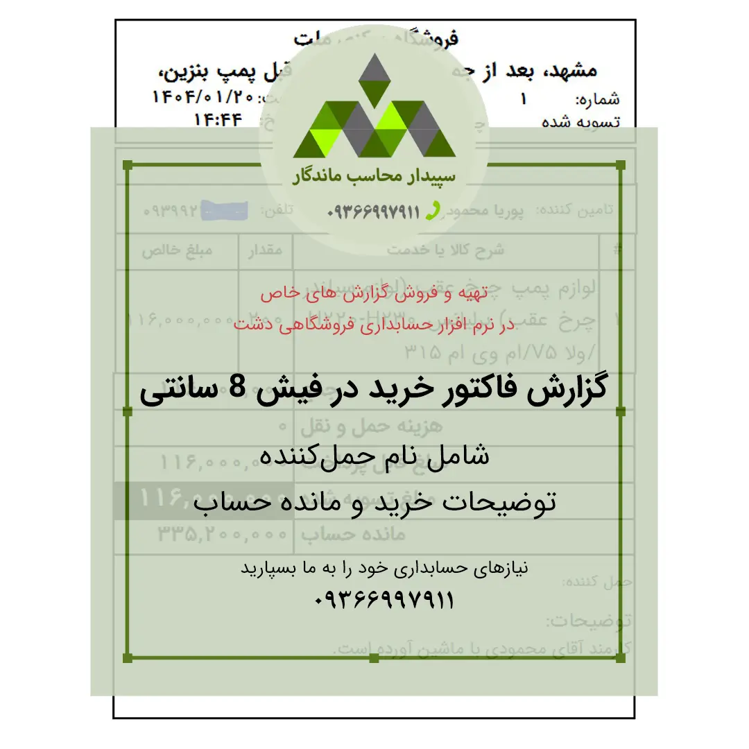خانه محصولات گزارش های دشت گزارش فاکتور خرید 8 سانتی با حمل‌کننده، توضیحات و مانده حساب