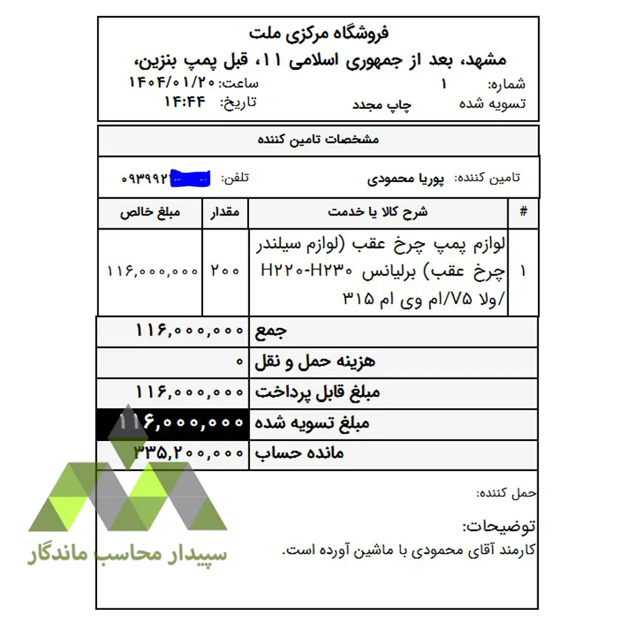 این گزارش ویژه دشت طراحی شده و شامل نام حمل‌کننده، توضیحات خرید و مانده حساب است تا مدیریت خریدهای شما دقیق‌تر شود.